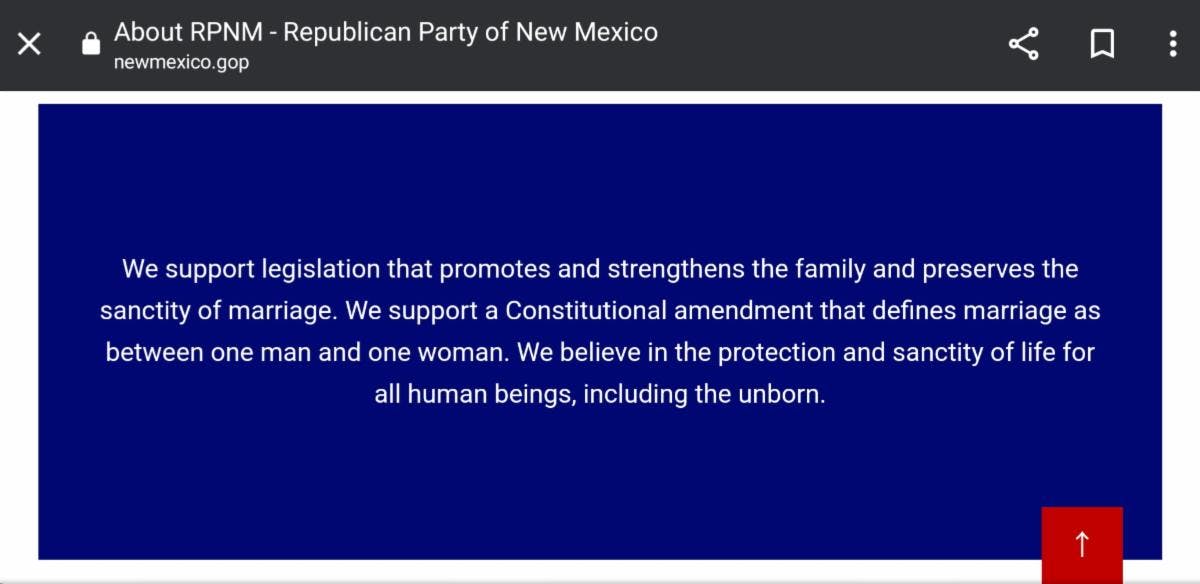 National and New Mexican Republicans continue to undermine marriage equality and oppose fundamental LGBTQIA+ rights. The New Mexico GOP’s website openly details their discriminatory position that "defines marriage between one man and one woman".